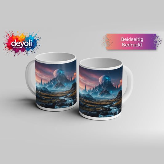 Motivtasse Fremde Welt – Spitzenberge unter kosmischem Licht.