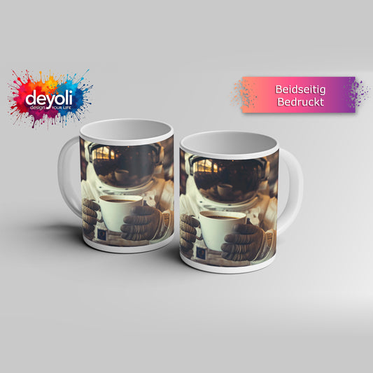 Motivtasse Kaffeepause im Kosmos – Astronaut genießt irdischen Genuss.