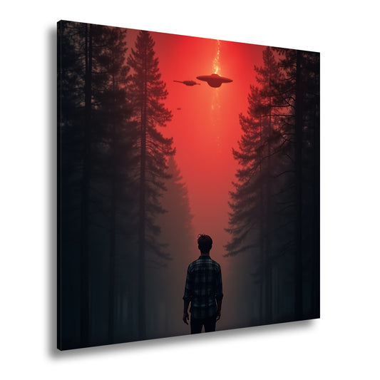 Leinwandbild Ein roter Himmel, Ufos und Staunen im düsteren Wald.