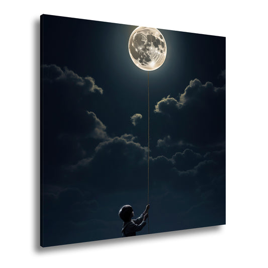 Leinwandbild Kind hält den Mond wie einen Traum an einer Schnur