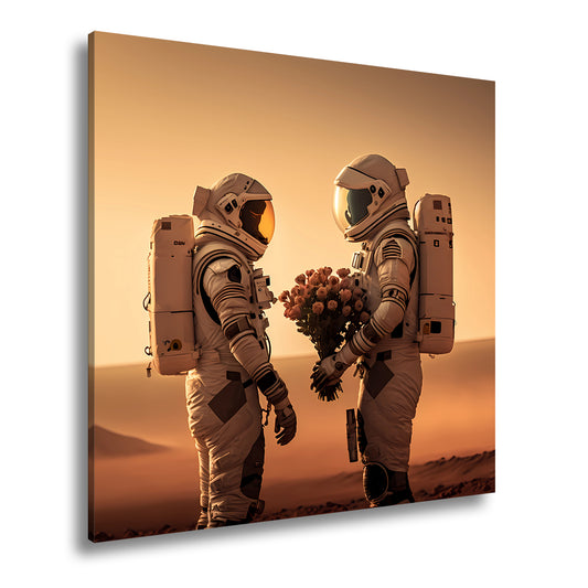 Leinwandbild Liebe im All – zwei Astronauten teilen Blumen auf dem Mars.