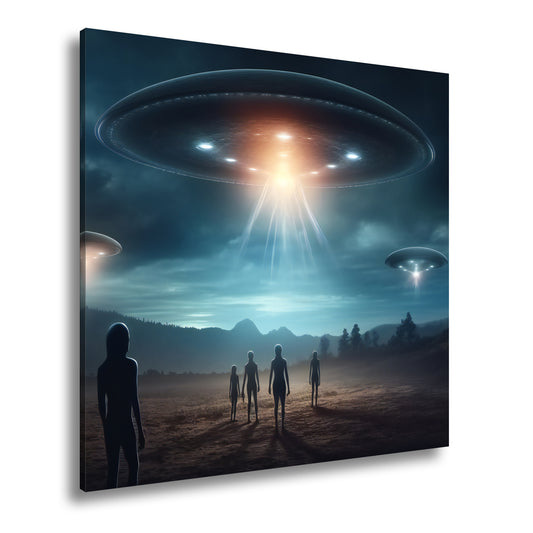 Leinwandbild Fremdes Schweigen – ein UFO schwebt über dunklem Wald.